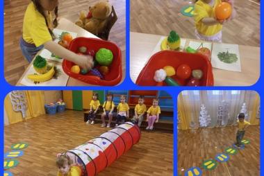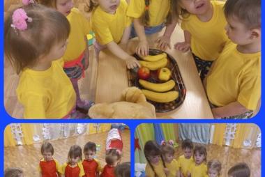 К малышам группы Цыплята приходил уже знакомый им Мишка. В игровой форме дети вместе с ним получили и уточнили знания о том что овощи и фрукты - полезные продукты. Чтобы быть здоровым и крепким, надо каждый день употреблять их в своём рационе.